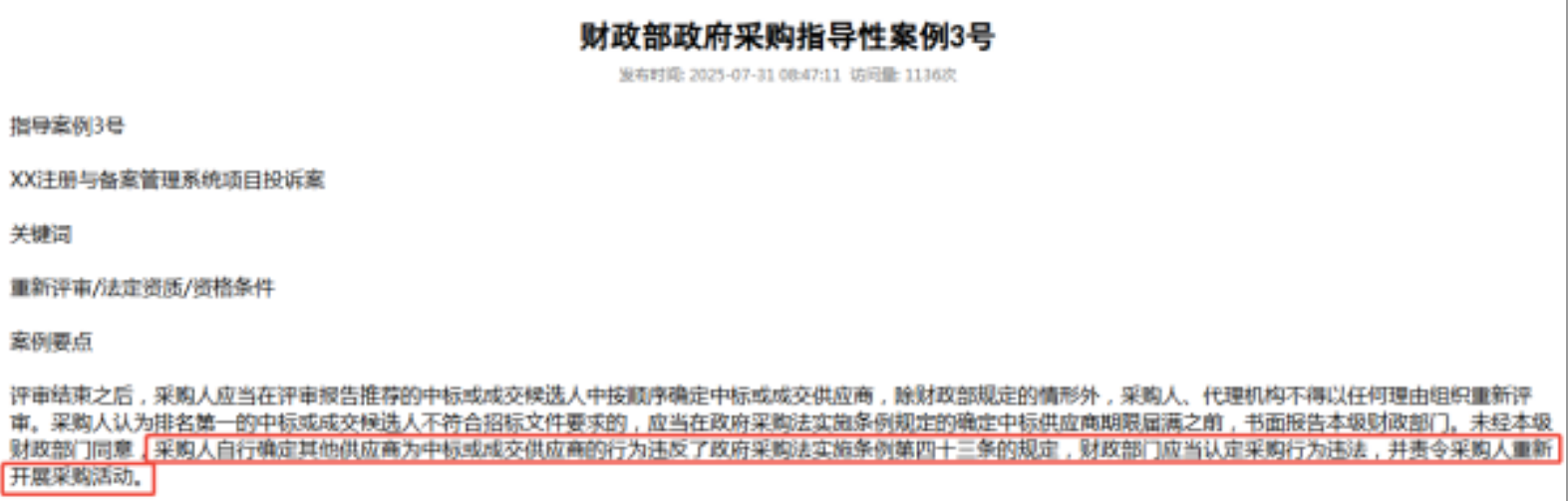 你有没有过这样的想法——看到中标候选人公示,就默认排名第一的就是最终中标人? 先给大家看一个真实案例,看完你就懂了—— 一、第一中标候选人被更换了 采购人A委托代理机构B就“XX注册与备案管理系统项目”公开招标。 2016年7月B发布招标公告并完成开标评标,评标委员会推荐T公司为第一中标候选人。 但A拒绝确认该结果,自行指定第二候选人E公司为中标人,B于10月13日发布E公司中标的公告。 T公司向B提出质疑却被B以质疑超期为由拒绝答复;随后T公司又向财政部投诉。 财政部经审查后,认定采购行为违法,并责令采购人重新开展采购活动。 [image: 1772419945499-a883eea9-4fd0-429e-99b4-3aeff07999cc-image.png] 二、公示中标候选人到底在“公示”什么? 简单的说,中标候选人公示,是评标委员会完成评审后,把“初步合格、拟推荐中标”的1-3家供应商名单公之于众,公示期一般不少于3天(依法必招项目有明确时限要求)。 它的核心目的,不是确定中标人,而是接受社会监督、受理异议和投诉——相当于给项目“踩刹车”,排查有没有违规、造假、评审失误等问题,确保采购过程公平公正。 只有公示期结束,没有收到有效异议和投诉,或者投诉、异议不成立,招标人才会正式确定中标人,发布“中标结果公示”,之后再发放中标通知书。 三、为什么说公示中标候选人≠已决定中标人? 结合中国政府采购网及各省公共资源交易平台通报的真实案例,以下几种情形发生,第一中标候选人也会被刷: 1、资质/材料造假 这是最致命也最常见的坑! [image: 1772421787026-699c1f3d-1e72-4857-a042-5e8a3eee178c-image.png] 很多供应商为了入围,在资质、业绩、人员配置上“打擦边球”,觉得“先入围,后续再补”“一点小问题没人查”; 殊不知公示期就是“照妖镜”,竞争对手和监管部门都会盯着你。 2、技术/参数未实质性响应 很多供应商觉得“入围了就没事了”,却忘了公示期还会被核查投标文件的响应性; 只要技术参数、商务要求与招标文件有偏差,哪怕是一字之差、一个细节缺失,都可能被认定为“未实质性响应”,直接取消资格。 3、不按要求提交担保 很多招标文件会明确要求,中标候选人需在规定期限内提交低价风险担保、履约担保等; 这是验证企业履约能力的关键环节,一旦逾期未提交,哪怕是第一候选人,也会被直接取消资格。 4、评审程序违规 有时候,废标和投标人无关,问题出在招标方或评标委员会身上,但最终受损的,还是中标候选人。 程序合法是中标结果有效的前提,只要评审、招标程序违规,中标候选人资格就可能被撤销。 常见违规情形:评标专家资格不合规、未回避利益关联;评审时评分计算错误、重大漏评错评;招标方未按规定公示异议受理方式等。 5、中标后拒绝履约 有些企业中标后,觉得“项目稳了”,开始漫天要价、拒绝签订合同,或者以“资金不足、人员不够”为由,丧失履约能力。 这些行为,相当于主动放弃中标资格,招标方有权依法取消其候选人资格。 法律明确规定:中标人无正当理由拒绝签订合同,或者在签订合同时向招标人提出附加条件的,招标人可以取消其中标资格,并没收投标保证金; 给招标人造成的损失超过投标保证金数额的,中标人还应当对超过部分予以赔偿。 6、客观变故不可抗 这种情形虽不常见,但一旦发生,只能被动接受。 因政策调整、规划变更、项目资金取消等不可抗力,导致原采购任务不复存在,哪怕中标候选人公示已结束,招标方也可依法取消候选人资格,终止采购流程。 招投标、政府采购,讲究的都是“程序合规、公平公正”。 中标候选人公示,是这个过程中不可或缺的监督环节,它不是终点,只是通往最终结果的“必经之路”。 愿每一个从业者,都能看清这个核心区别,不踩坑、不内耗,凭借实力拿下每一个项目。