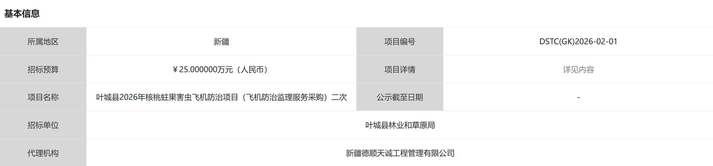 [image: 1774003823709-3c0ee3f4-bb15-4be5-8845-9ccd730b37bb-image-resized.png] 项目概况 叶城县2026年核桃蛀果害虫飞机防治项目(飞机防治监理服务采购)二次招标项目的潜在投标人应在政采云平台线上获取招标文件,并于2026年04月08日 11:00(北京时间)前递交投标文件。 一、项目基本情况 项目编号:DSTC(GK)2026-02-01 项目名称:叶城县2026年核桃蛀果害虫飞机防治项目(飞机防治监理服务采购)二次 采购方式:公开招标 预算金额(元):250000 最高限价(元):250000 采购需求: 标项名称:叶城县2026年核桃蛀果害虫飞机防治项目(飞机防治监理服务采购)二次 数量:1 预算金额(元):250000 单位: 项 简要规格描述或项目基本概况介绍、用途:飞机防治监理服务采购;详见采购文件。 备注: 合同履约期限:标项 1,签订合同后甲方规定时间,规定地点进行服务(具体以签订合同为准); 本项目(否)接受联合体投标。 二、申请人的资格要求: 1.满足《中华人民共和国政府采购法》第二十二条规定; 2.落实政府采购政策需满足的资格要求:标项1:本项目专门面向小微企业 3.本项目的特定资格要求:无 三、获取招标文件 时间:2026年03月18日至2026年03月26日,每天上午00:00至14:00,下午14:00至23:59(北京时间,法定节假日除外) 地点:政采云平台线上 方式:供应商登录政采云平台https://www.zcygov.cn/在线申请获取采购文件(进入“项目采购”应用,在获取采购文件菜单中选择项目,申请获取采购文件),或者点击采购公告底部潜在供应商“获取采购文件”,页面跳转后登陆,直接获取采购文件。 售价(元):0 四、提交投标文件截止时间、开标时间和地点 提交投标文件截止时间:2026年04月08日 11:00(北京时间) 投标地点:请登录政采云投标客户端投标 开标时间:2026年04月08日 11:00(北京时间) 开标地点:投标人登录政采云平台https://www.zcygov.cn/,进入“项目采购-开标评标-右边选择对应项目点击“进入项目”进入开标大厅。 五、公告期限 自本公告发布之日起5个工作日。 六、其他补充事宜 1、本项目实行网上投标,采用电子投标文件。 2、各供应商应在开标前确保成为正式注册入库供应商,并完成CA数字证书(符合国密标准)申领。因未注册入库、未办理CA数字证书等原因造成无法投标或投标失败等后果由供应商自行承担。如需咨询,请联系新疆-安信CA服务热线0991-7810912;翔晟CA服务热线025-66085508;新疆CA服务热线4000921999。 3、供应商将政采云电子交易客户端下载、安装完成后,可通过账号密码或CA登录客户端进行投标文件的制作。在使用政采云投标客户端时,建议使用WIN7及以上操作系统。 4、其他事项: 1.本项目为电子招投标,供应商需要使用CA加密设备,凡参加本项目必须可自主通过新疆CA申领渠道“新疆政务通”申请政采云平台可使用的CA设备,如原有兵团或公共资源使用的CA,可与新疆CA联系,申请增加电子证书即可,无需重复申领。 2.本项目实行网上投标,采用电子投标文件(供应商须使用CA加密设备通过政采云电子投标客户端制作投标文件)。若供应商参与投标,自行承担投标一切费用。 3.各供应商应在开标前应确保成为新疆政府采购网正式注册入库供应商,并完成CA数字证书申领。因未注册入库、未办理CA数字证书等原因造成无法投标或投标失败等后果由供应商自行承担。 4.供应商将政采云电子交易客户端下载、安装完成后,可通过账号密码或CA登录客户端进行投标文件制作。在使用政采云投标客户端时,建议使用WIN7及以上操作系统。客户端请至新疆政府采购网(http://www.ccgp-xinjiang.gov.cn/)下载专区查看,如有问题可拨打政采云客户服务热线95763进行咨询。 5.供应商在开标时须使用制作加密电子投标文件所使用的CA锁及电脑,电脑须提前配置好浏览器(建议使用谷歌浏览器),以便开标时解锁。 特别提示: 1、采购限额标准以上,200万元以下的货物和服务采购项目、400万元以下的工程采购项目,适宜由中小企业提供的,采购人应当专门面向中小企业采购。 2、超过200万元的货物和服务采购项目,预留该部分采购项目预算总额的30%以上专门面向中小企业采购,其中预留给小微企业的比例不低于60%。 3、超过400万元的工程采购项目中适宜由中小企业提供的,预留该部分采购项目预算总额的40%以上专门面向中小企业采购,其中预留给小微企业的比例不低于60%。 4、对于未预留份额专门面向中小企业的采购项目,以及预留份额项目中的非预留部分采购包,采购人、采购代理机构应当对符合规定的小微企业报价给予10%~20%(工程项目为3%~5%)的扣除,用扣除后的价格参加评审。适用招标投标法的政府采购工程建设项目,采用综合评估法但未采用低价优先法计算价格分的,评标时应当在采用原报价进行评分的基础上增加其价格得分的3%~5%作为其价格分。 5、接受大中型企业与小微企业组成联合体或者允许大中型企业向一家或者多家小微企业分包的采购项目,对于联合协议或者分包意向协议约定小微企业的合同份额占到合同总金额30%以上的,采购人、采购代理机构应当对联合体或者大中型企业的报价给予4%~6%(工程项目为1%~2%)的扣除,用扣除后的价格参加评审。适用招标投标法的政府采购工程建设项目,采用综合评估法但未采用低价优先法计算价格分的,评标时应当在采用原报价进行评分的基础上增加其价格得分的1%~2%作为其价格分。 七、对本次采购提出询问,请按以下方式联